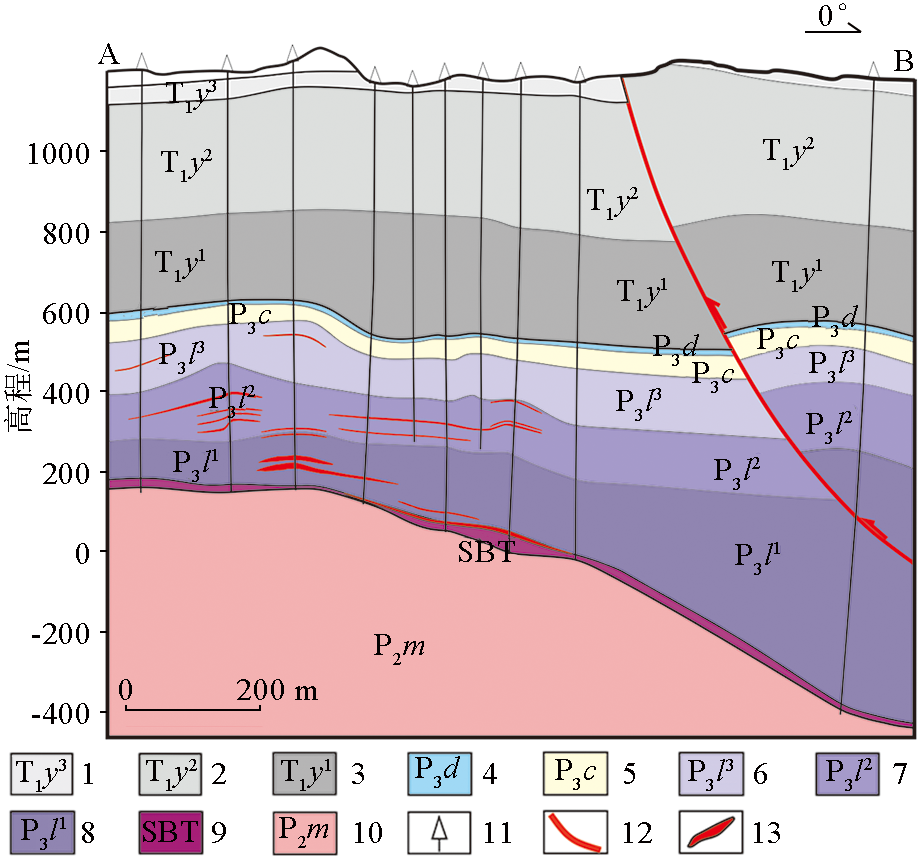 | Fig.2 Geological cross-section A-B through the Nayang section of the Shuiyindong Carlin-type gold deposit (the position of A-B is shown in 1—the third unit of the Yelang formation;2—the second unit of the Yelang formation;3—the first unit of the Yelang formation;4—Dalong formation;5—Changxing formation;6—the third unit of the Longtan formation;7—the second unit of the Longtan formation;8—the first unit of the Longtan formation;9—unconformity(SBT);10—Maokou formation;11—drill hole;12—fault;13—orebody |