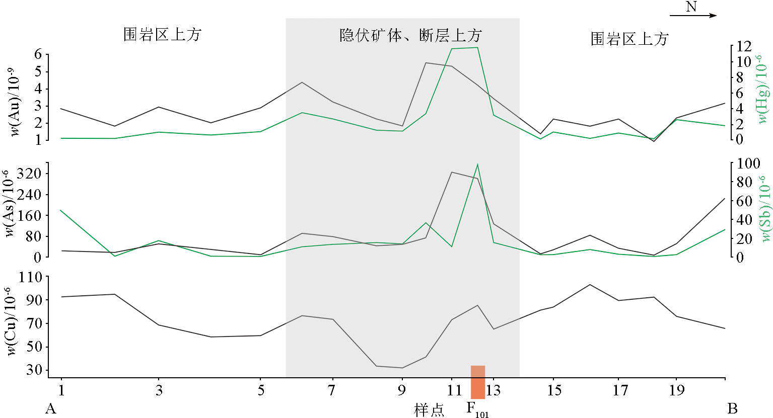| Fig.4 Change trends of five trace elements in fine-grained soils along the exploration line in the Nayang section of the Shuiyindong gold deposit |