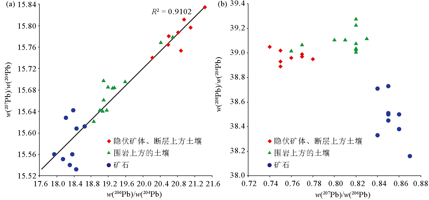 | Fig.7 w(207Pb)/w(204Pb)-w(206Pb)/w(204Pb)(a)、w(208Pb)/w(204Pb)-w(207Pb)/w(206Pb)(b) diagram of the surface soil and ore pyrite in the Nayang section of Shuiyindong Carlin-type gold deposit |