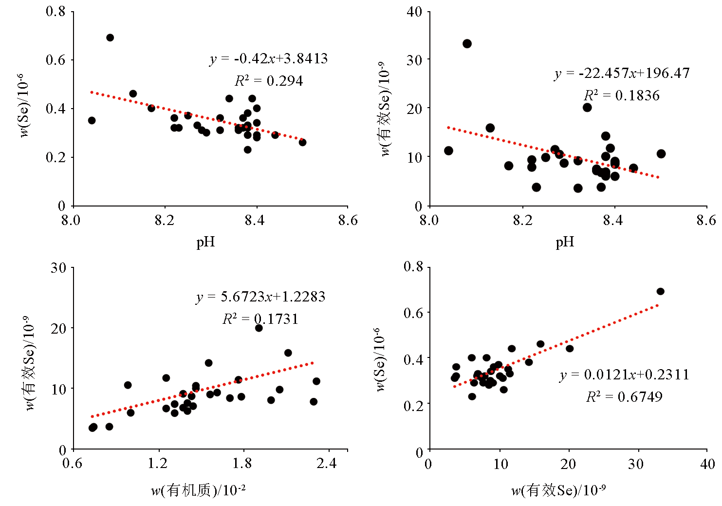 | Fig.4 Relationship between total Se and available Se of root soil and soil pH and organic matter indexs |