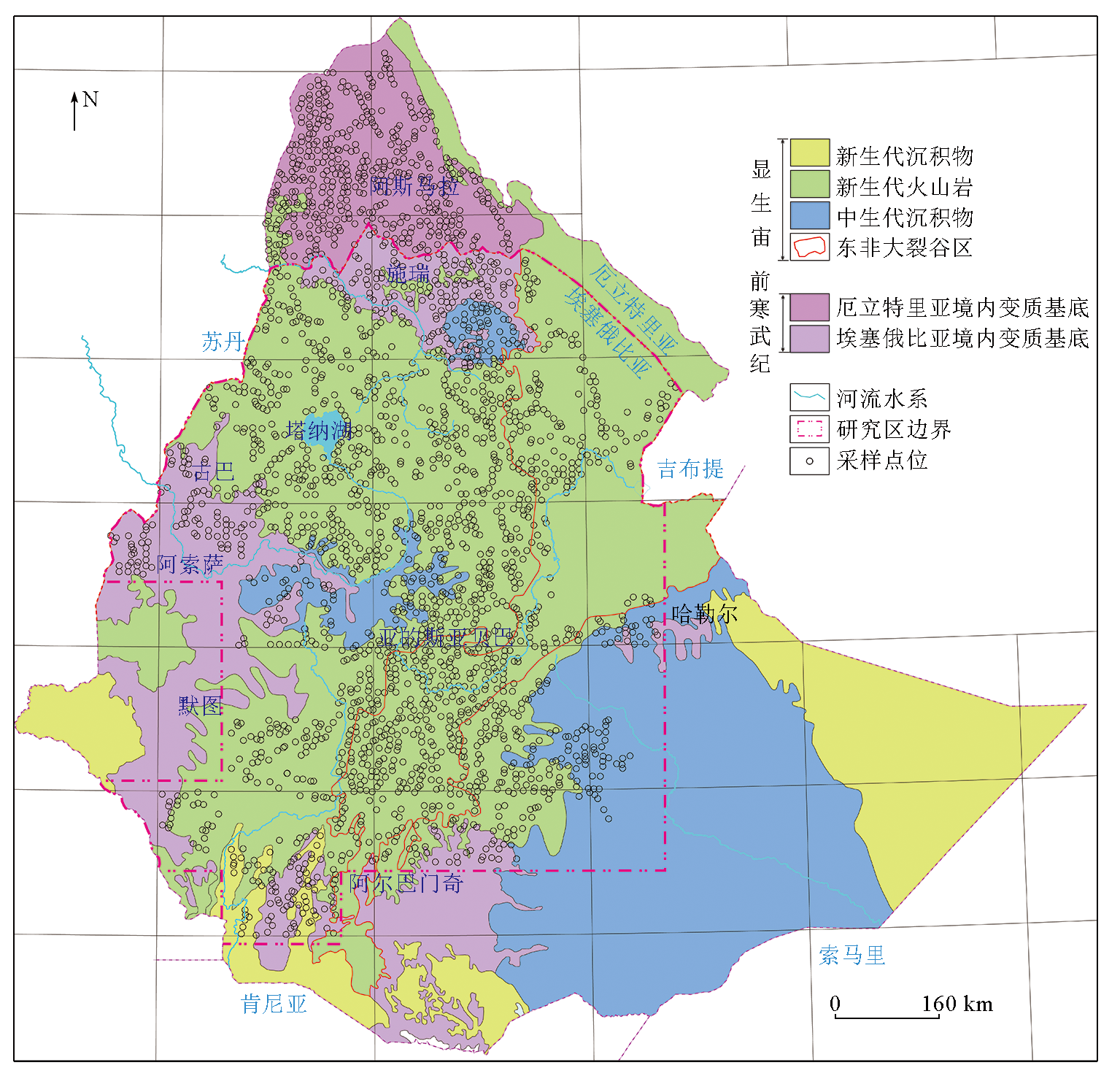 | 图1 埃塞俄比亚—厄立特里亚地质及采样点位分布(据文献[ |