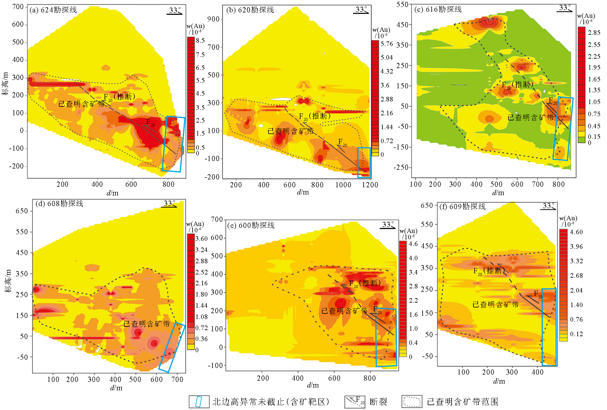 | 图5 者相金矿6条勘查线中Au异常分布 |