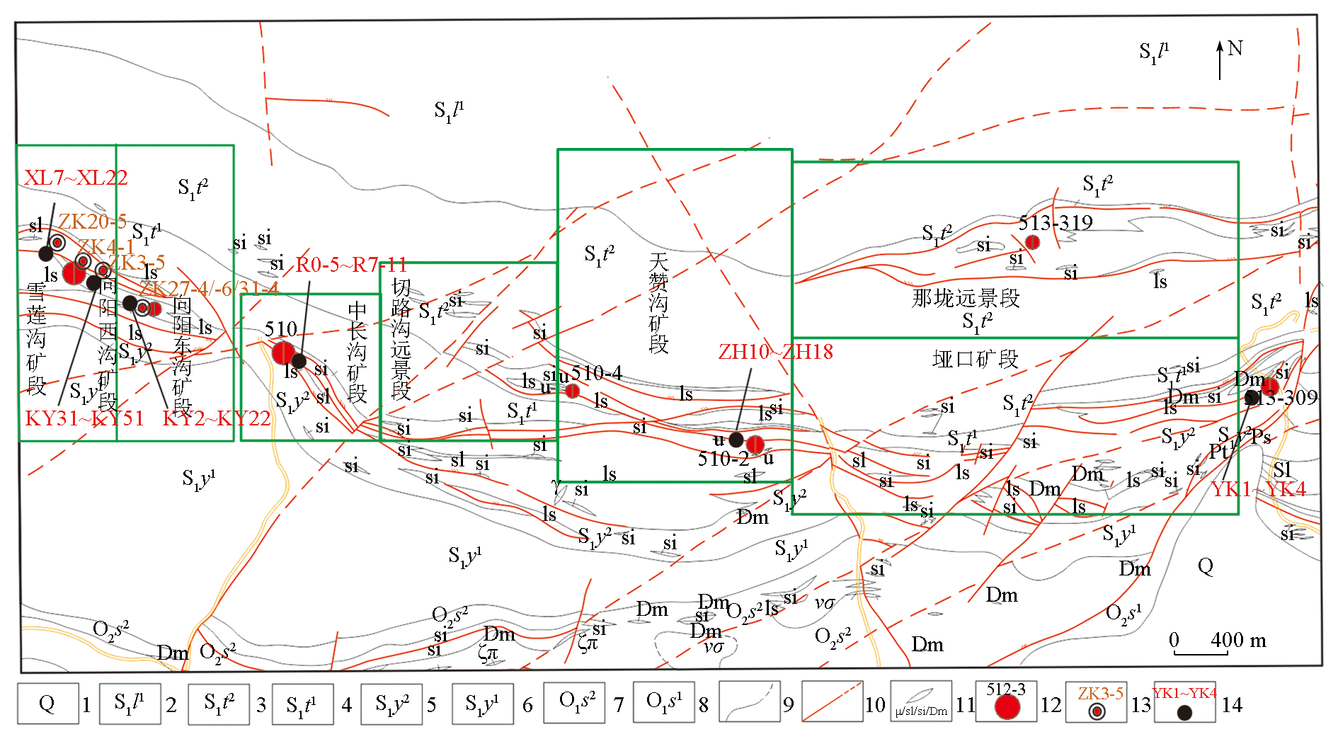 | 图1 510铀矿床地质略图(修改自陈田华等[ 1—第四系;2—拉垅组下段;3—塔尔组上段;4—塔尔组下段;5—羊肠沟组上段;6—羊肠沟组下段;7—苏里木塘组上段;8—苏里木塘组下段;9—地层界线;10—实测及推测断层;11—脉岩(μ—玢岩类;sl—板岩;si—硅质岩;Dm—白云岩);12—铀矿床;13—钻孔及编号;14—取样位置及编号 |