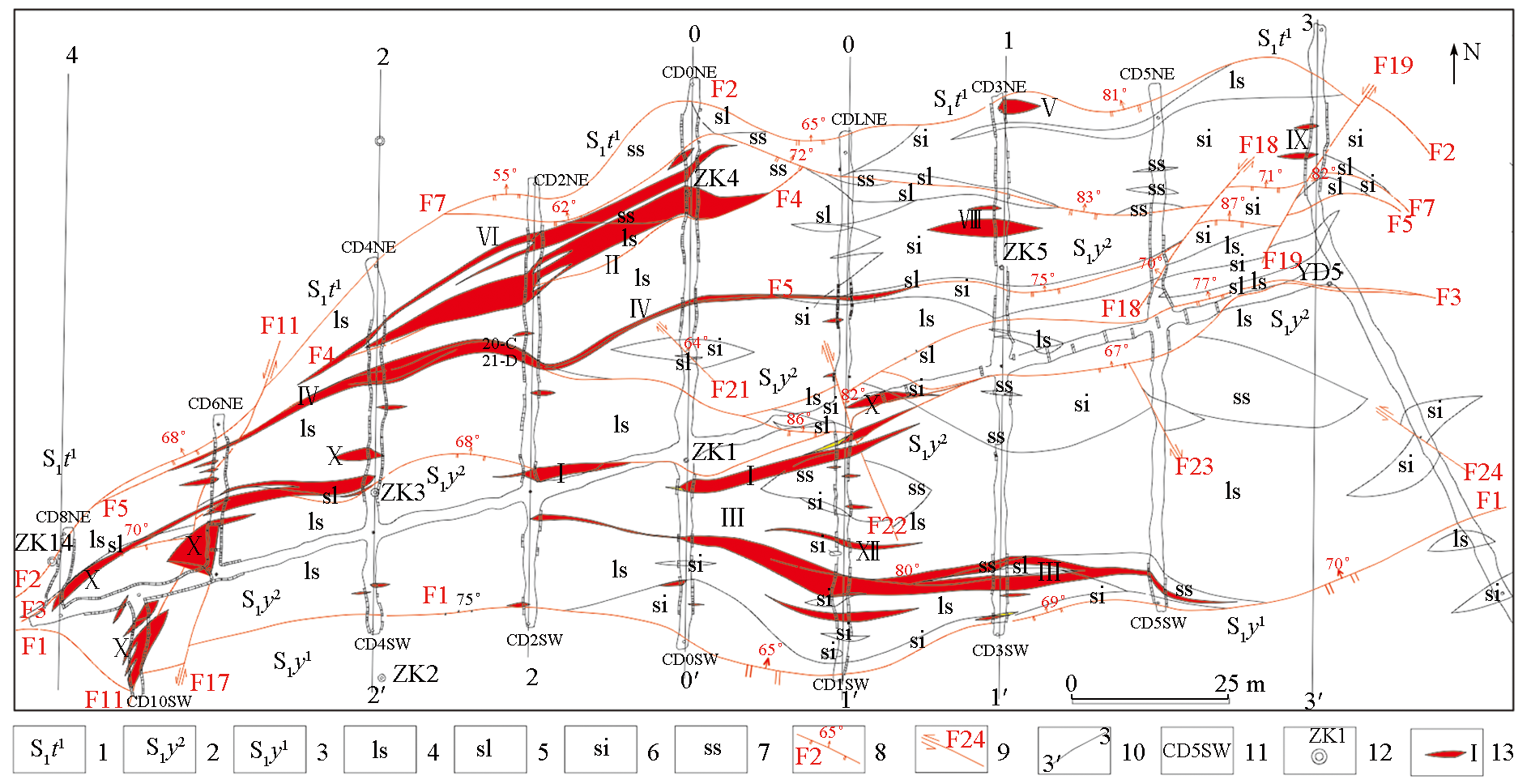 | Fig.2 Distribution map of ore body in the third middle section(3 478.61 m) of Zhongchanggou ore section of 510 uranium deposit (modified from Chen T H,et al.[ 1—lower member of Ta'er formation; 2—upper member of Yangchanggou formation;3—lower member of Yangchanggou formation;4—limestone;5—slate;6—siliceous;7—fine sandstone;8—reverse fault;9—strike-slip thrust fault; 10—location of exploration line and number;11—adit;12—borehole and number;13—industrial uranium ore body |