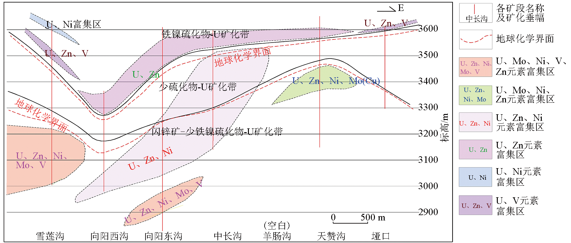 | 图5 510铀矿床铀伴生元素垂向、横向分带特征 |
