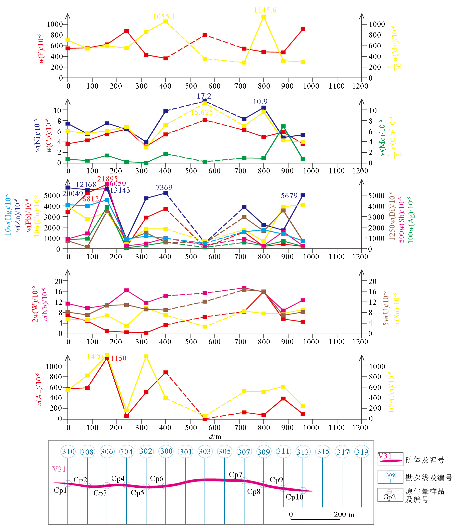 | Fig.6 Geological-geochemical profile of longitudinal primary halo in the middle section of -20 m of V31 orebody in Niuxingba deposit |