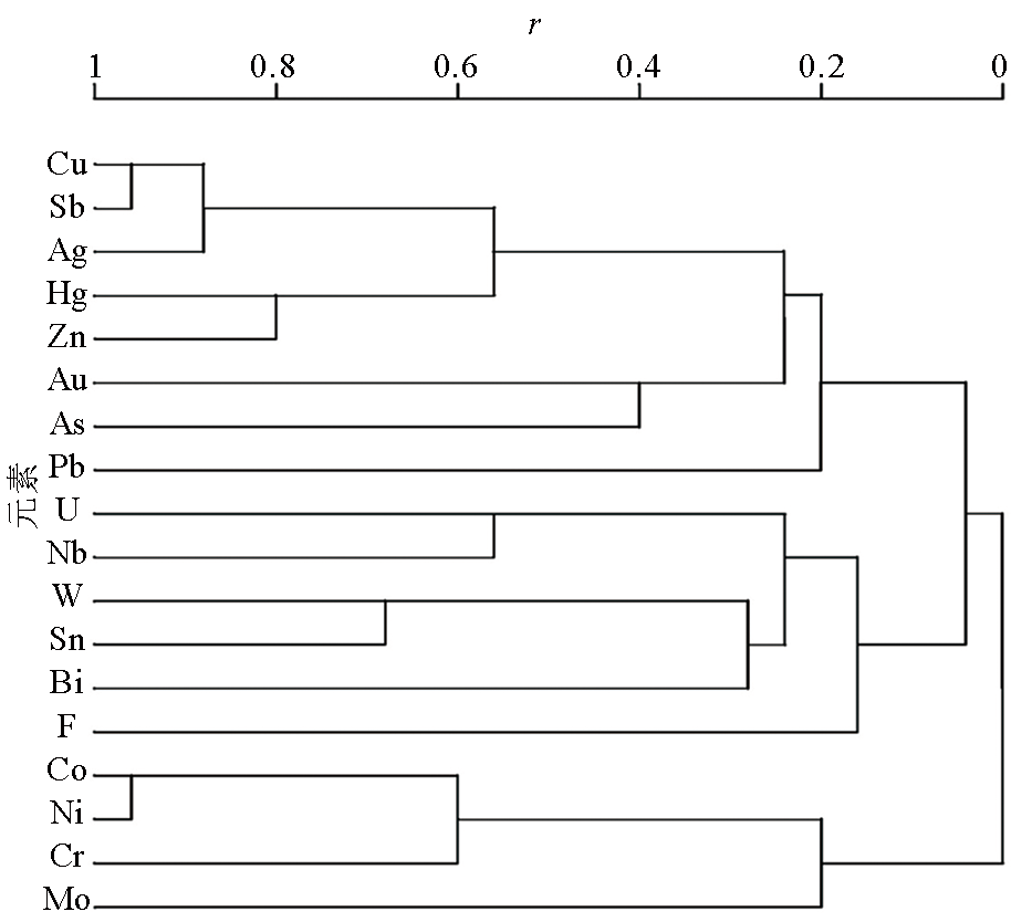 | Fig.7 R-type cluster analysis pedigree diagram of mineralization-forming halo of V31 ore belt (body) in Niuxingba deposit |