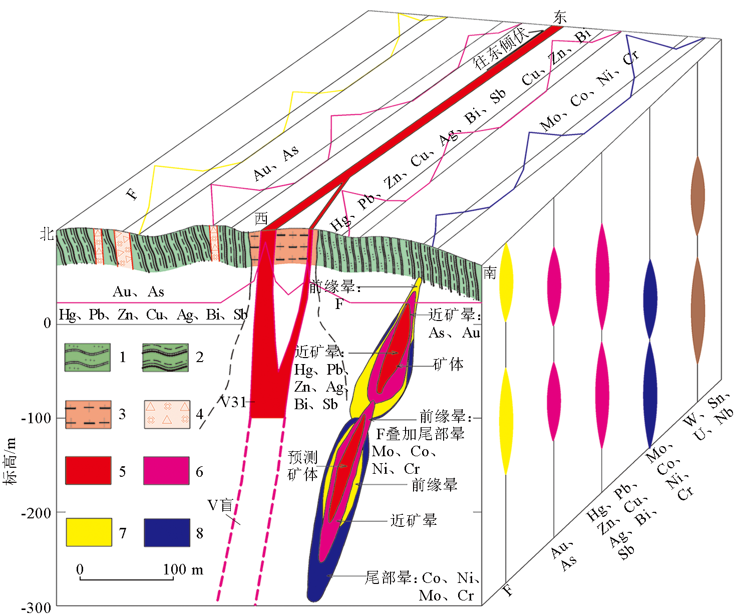 | Fig.8 The geological-geochemicalmodel of tectonicprimary halo in Niuxingba Pb-Zn-Au deposit 1—silty tuff;2—tuffaceous phyllite;3—granodiorite-porphyry;4—silicification crushing zone;5—ore body;6—near-halo anomaly;7—leading edge halo anomaly;8—tail halo anomaly |