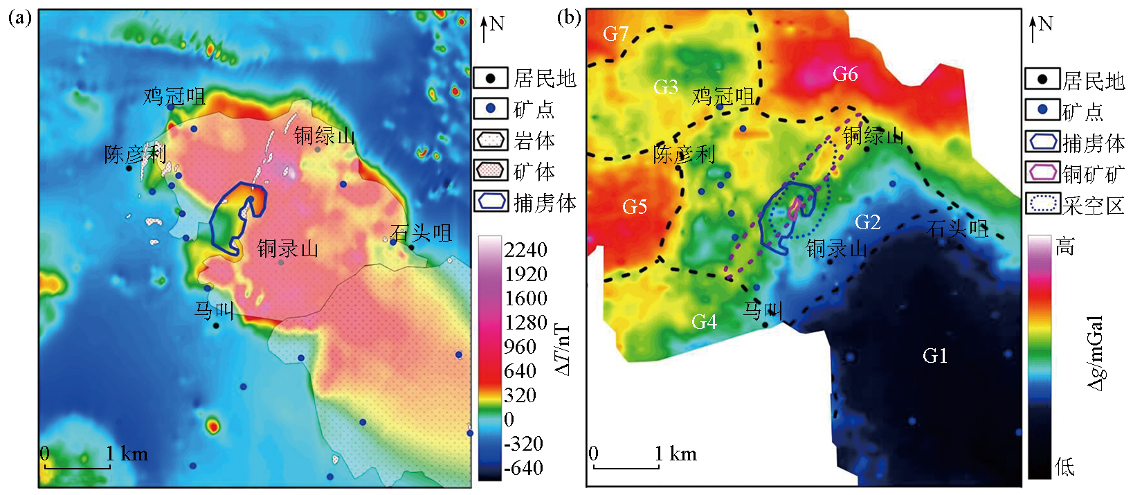| 图2 铜绿山矿田航磁化极异常(a)和布格重力异常(b) |