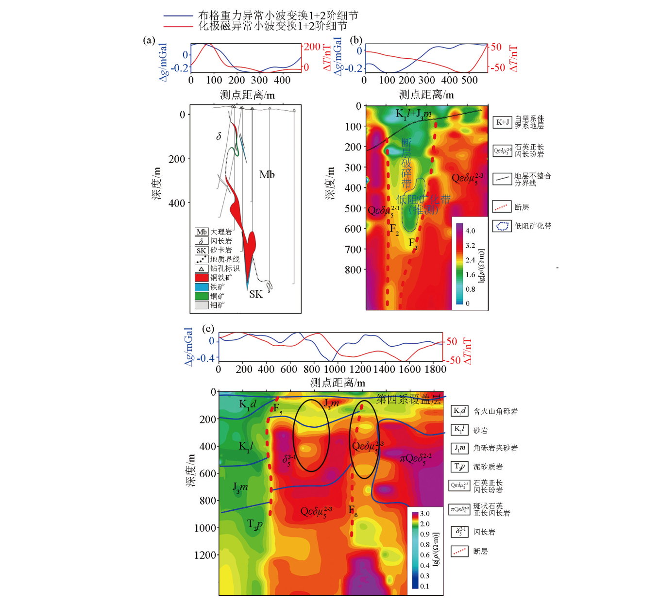 | 图8 地球物理综合解释剖面 a—13线地球物理综合解释剖面;b—B15线地球物理综合解释剖面;c—C27线地球物理综合解释剖面 |