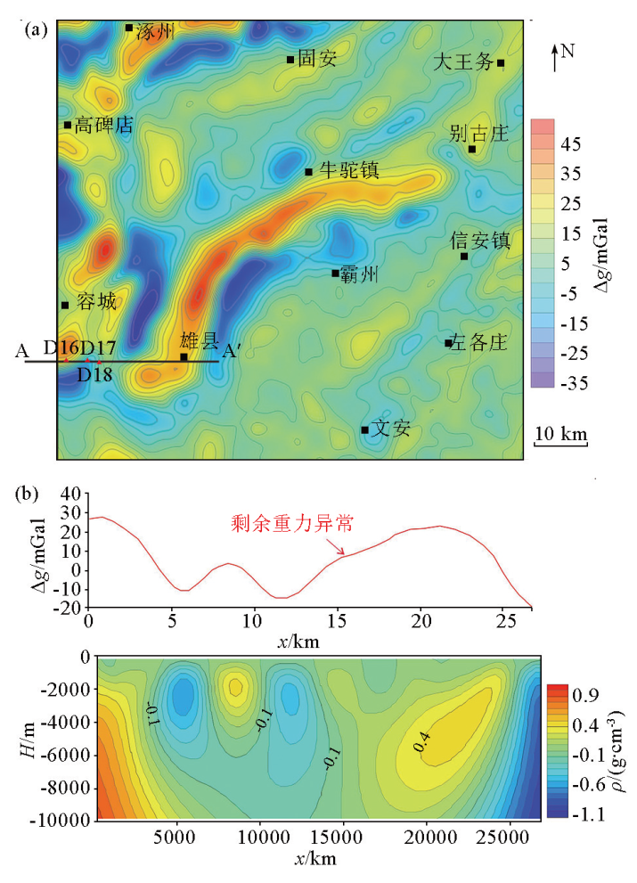 | 图2 雄安新区剩余重力异常分析 a—研究区重力异常;b—过A-A'线重力反演 |