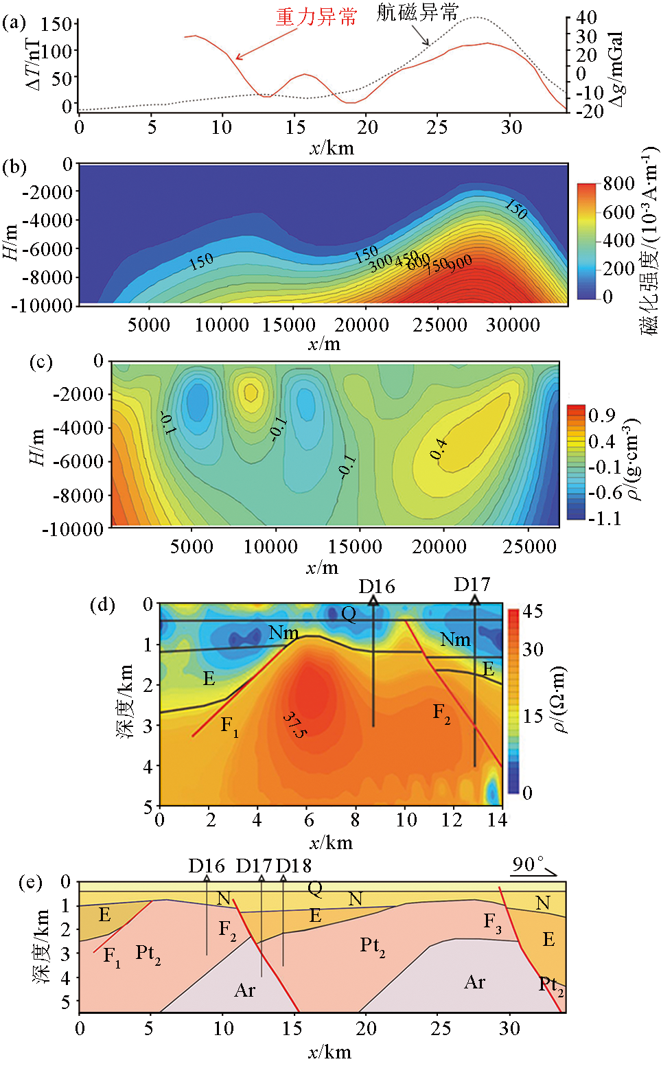 | 图6 A-A'线地质—地球物理综合解释剖面 a—重磁异常剖面;b—磁化强度反演剖面;c—重力反演剖面;d—大地电磁反演剖面;e—综合解释地质剖面 |