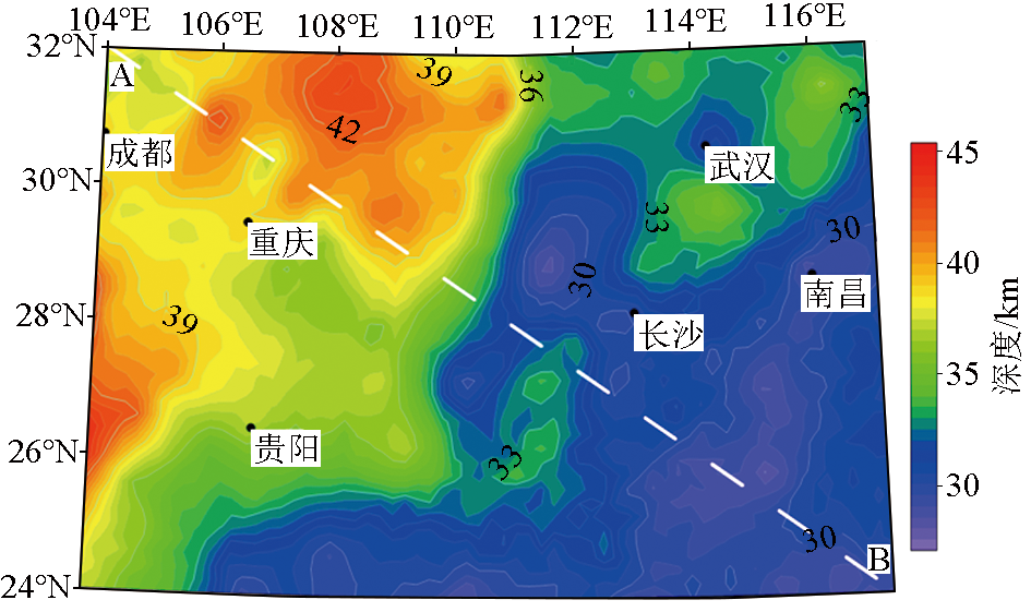 | Fig.3 Moho reference model of the central South China block The white dotted line denotes the location of the profile AB |