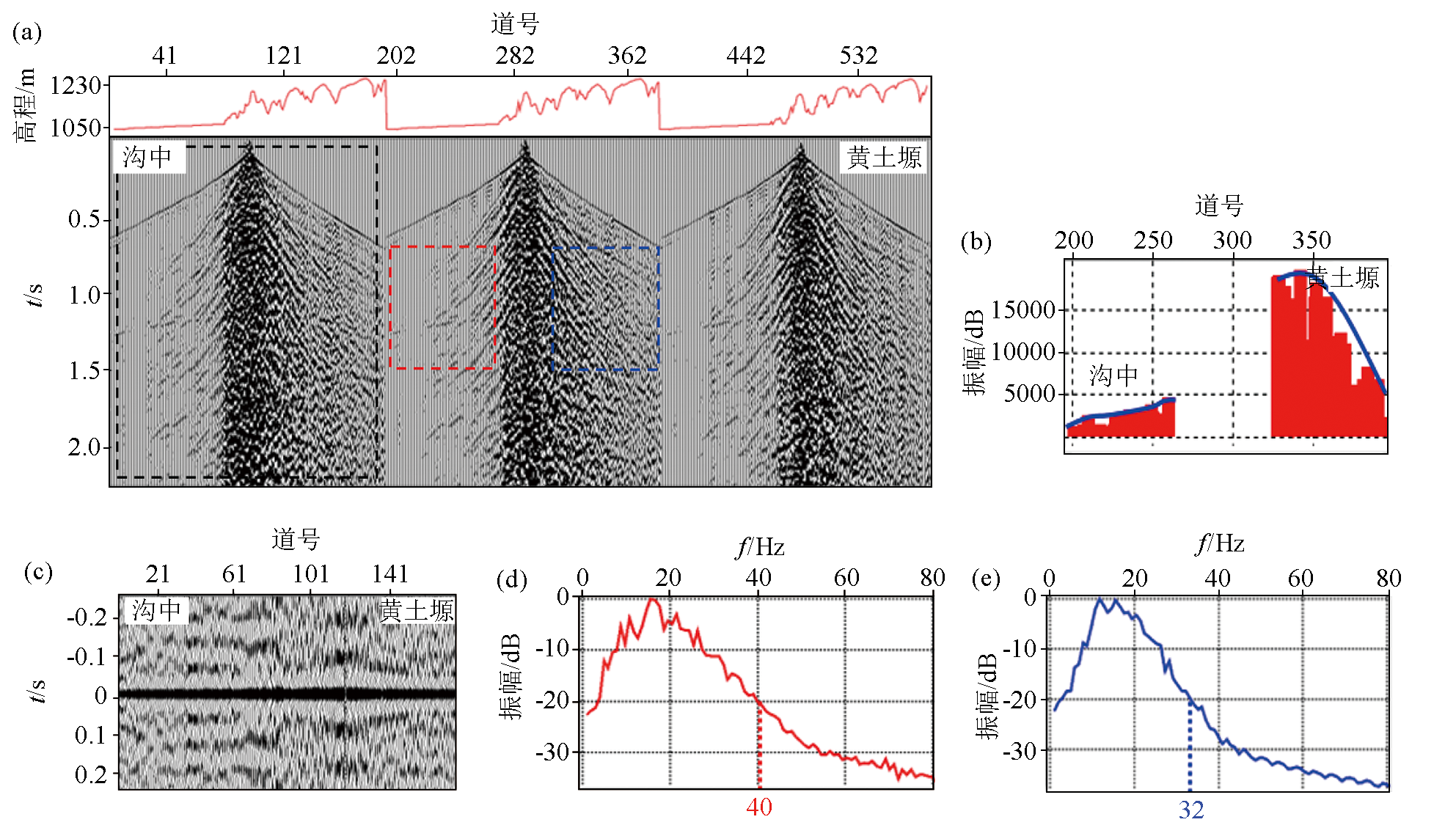 | 图1 沟塬连接区原始单炮、振幅统计、单炮自相关及频谱 a—原始单炮;b—单炮振幅统计(沟中图a中红框、黄土塬图a中蓝框);c—单炮自相关(图a中黑框);d—沟中排列频谱(图a中红框);e—黄土塬区排列频谱(图a中蓝框) |