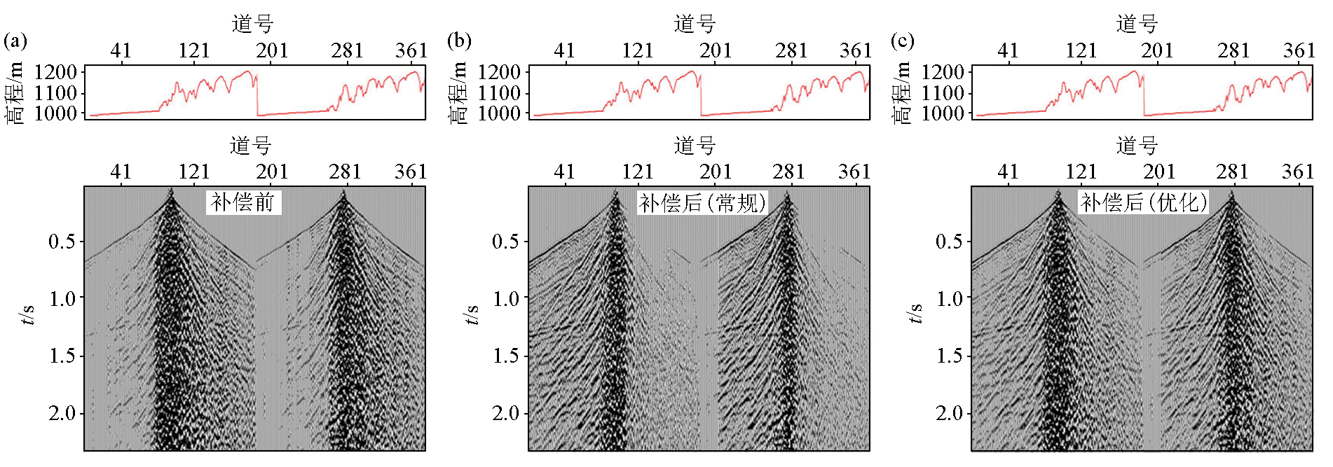 | 图6 沟塬连接区地表一致性振幅补偿前后单炮 a—补偿前单炮;b—传统方法补偿后单炮;c—本文方法补偿后单炮 |