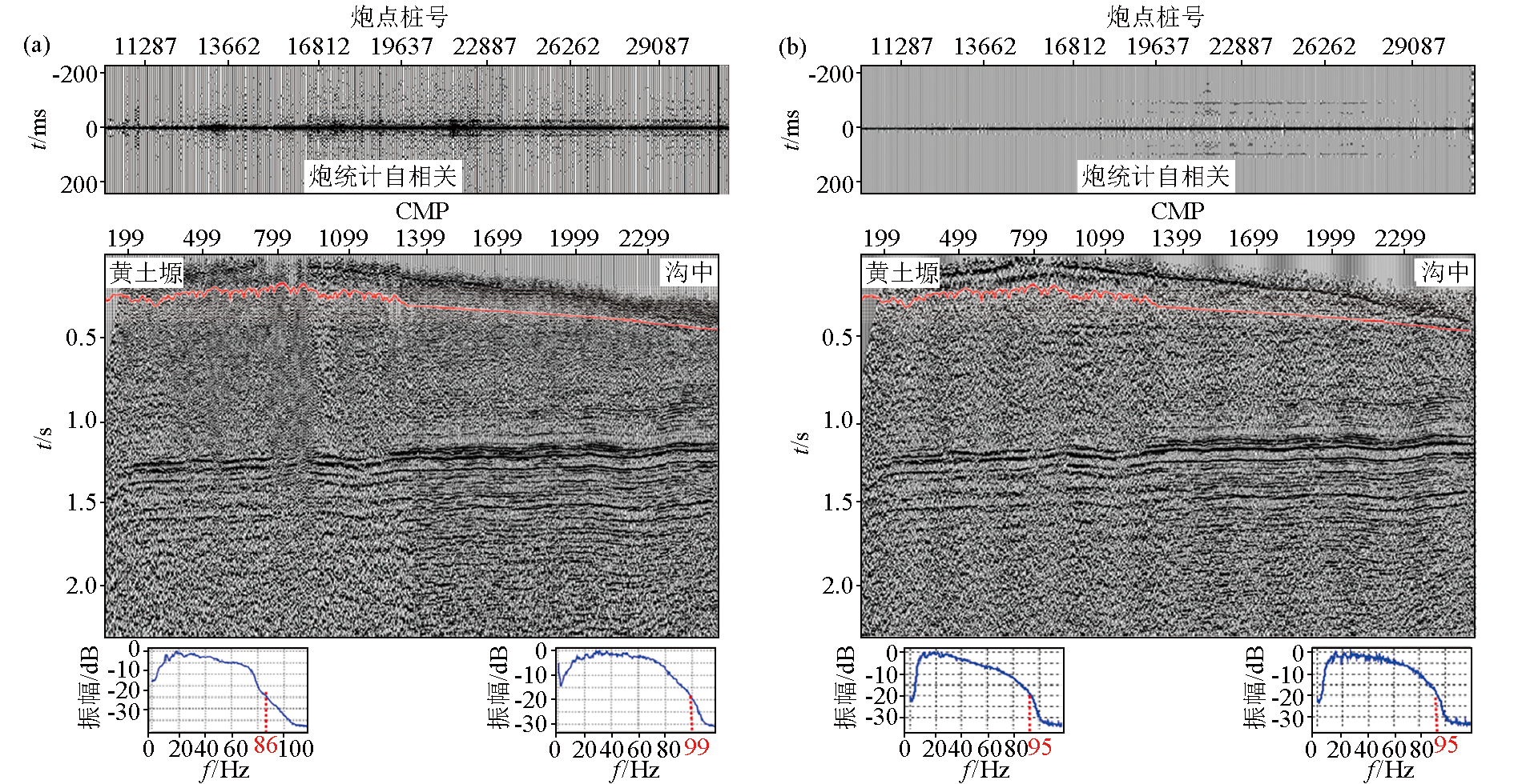 | 图8 不同反褶积后炮统计自相关及叠加剖面对比 a—地表一致性反褶积;b—俞式子波反褶积 |