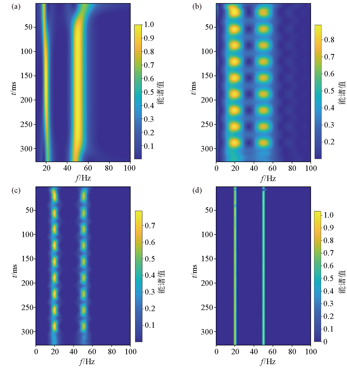| Fig.2 Comparisons of time-frequency spectrum of different time frequency analysis method a—time-frequency spectrum of CWT;b—time-frequency spectrum of RL2TFS;c—time-frequency spectrum of RL1TFS;d—time-frequency spectrum of RMSTFS |