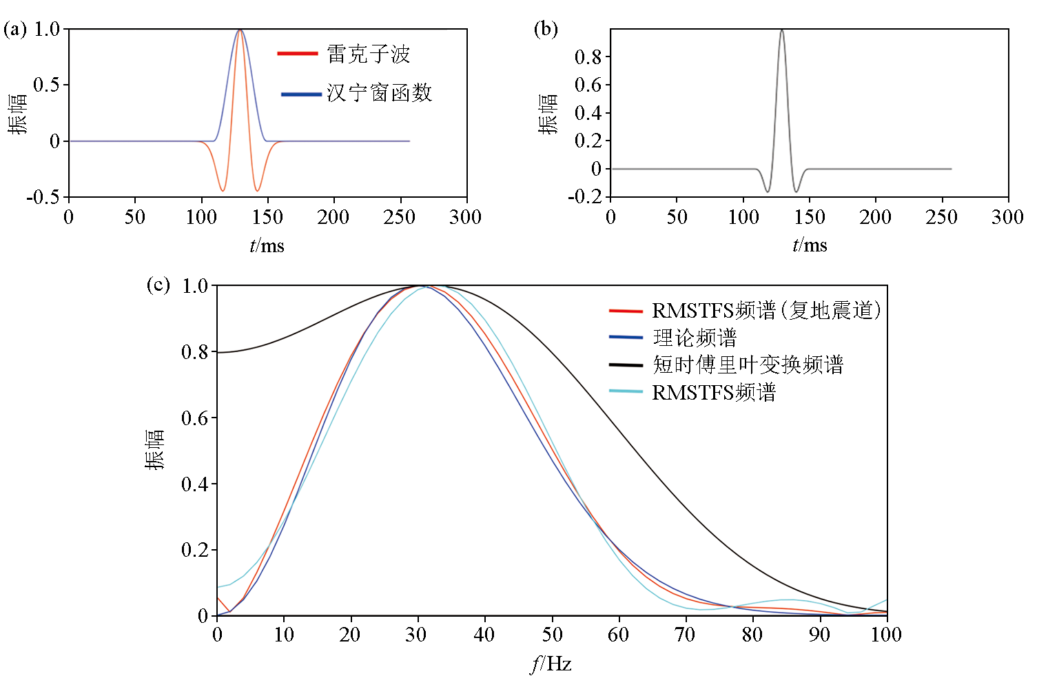 | 图3 40 ms汉宁窗作用于雷克子波得到的信号及其对应的频谱 a—40 ms汉宁窗函数及雷克子波叠合;b—汉宁窗作用于雷克子波得到信号;c—不同时频分析方法计算 |