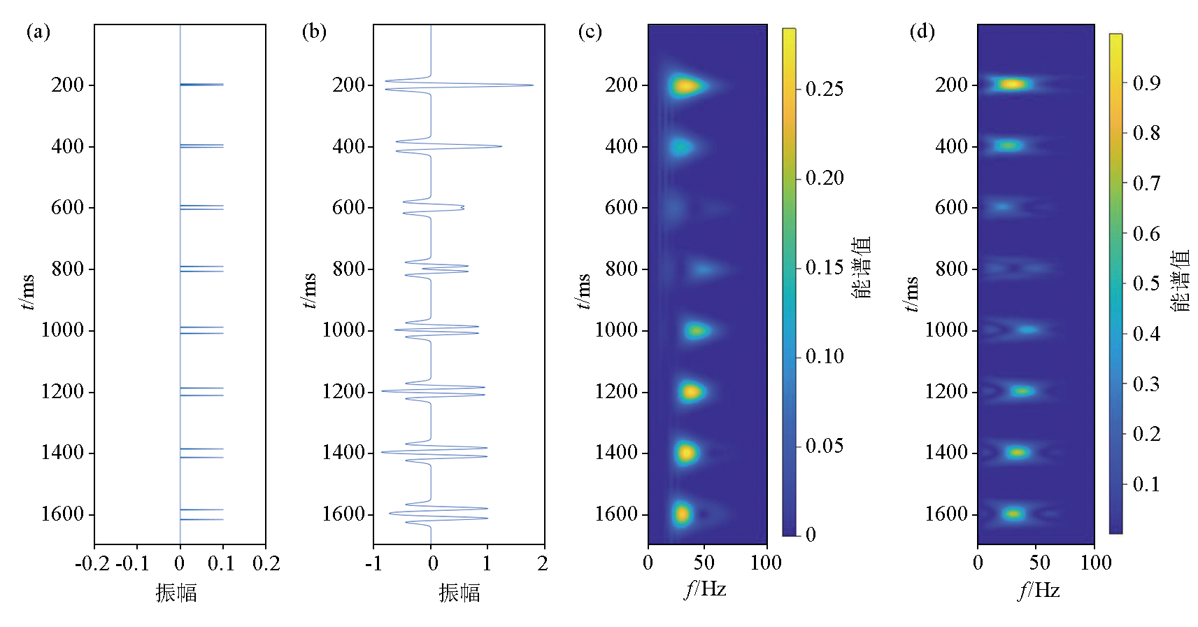 | Fig.5 Synthetic record of different thikness layers with same recflction coefficient on top and bottom and the corresponding time-frequency spectrum a—seismic reflection series;b—synthetic record;c—spectrum of CWT;d—spectrum of RMSTFS |