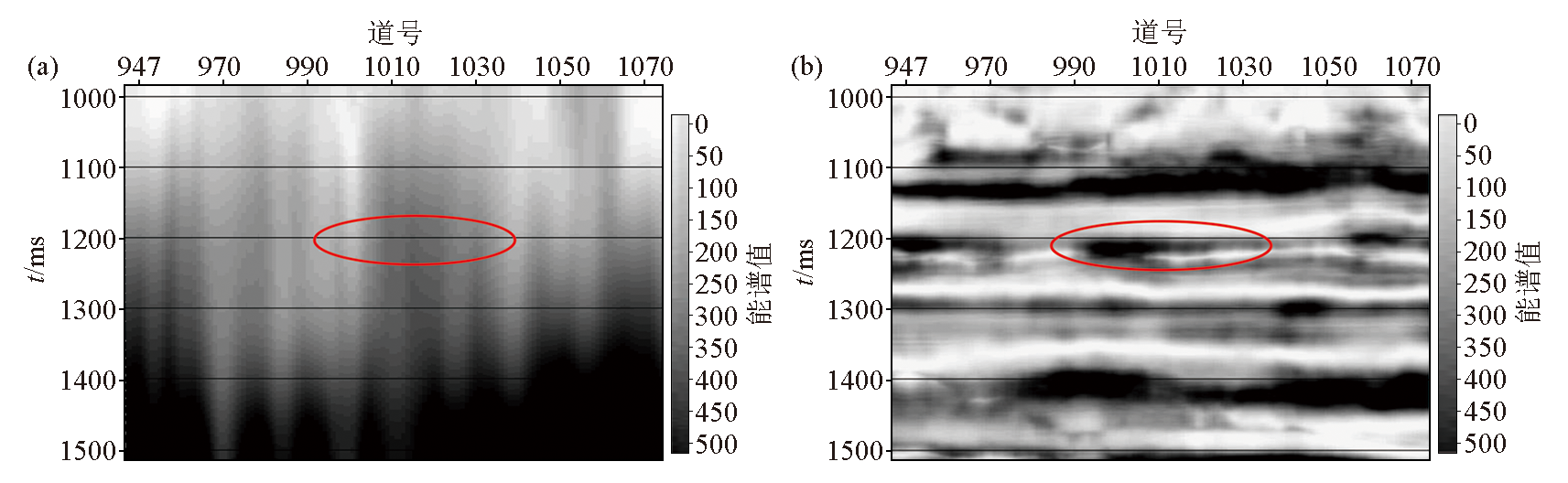 | 图9 连续小波变换及最小支撑约束稀疏时频分析得到10 Hz能谱剖面对比 a—连续小波变换10 Hz能谱剖面(局部放大);b—最小支撑约束时频分析10 Hz能谱剖面(局部放大) |