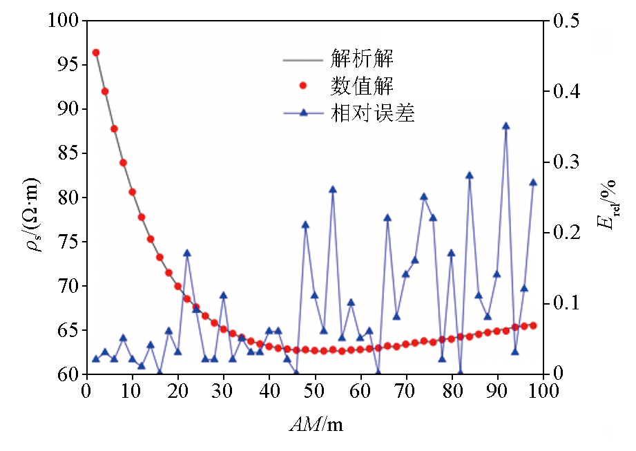 | Fig.4 Comparison of the numerical and analytical solutions of the apparent resistivity |
