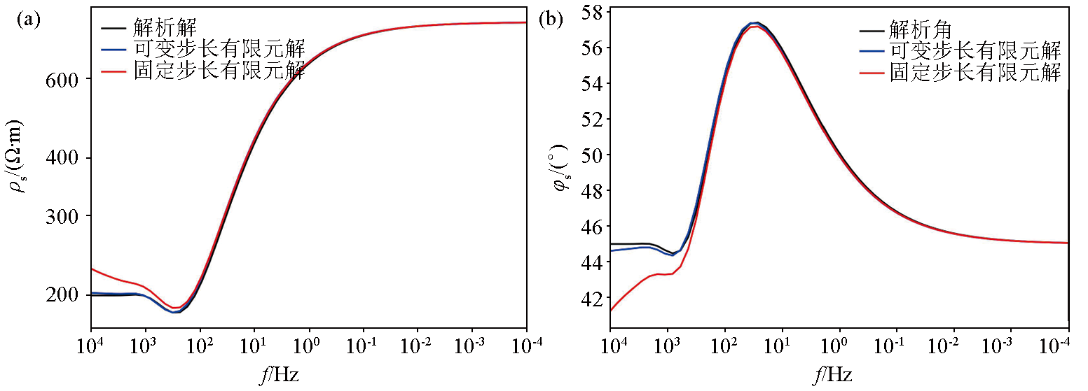 | 图4 固定步长和可变步长的有限元正演在简单地电模型(G型)中的正演结果对比 a—视电阻率结果对比;b—阻抗相位结果对比 |