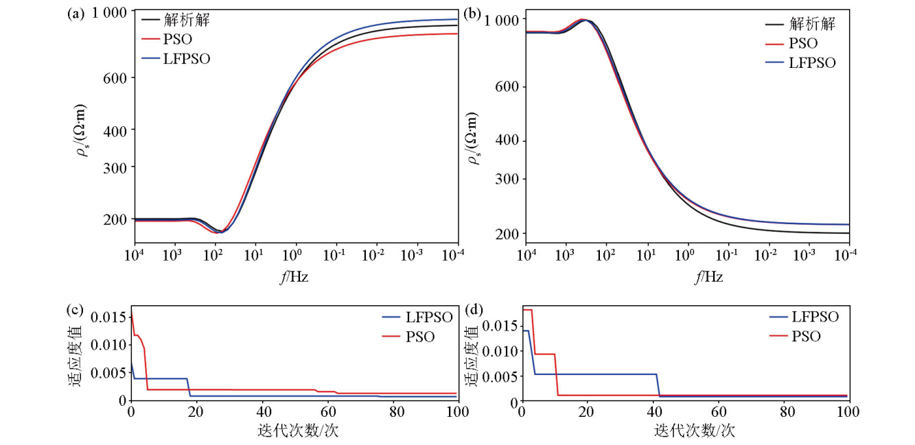 | Fig.5 Comparison of PSO and LFPSO inversion results and theoretical values of the two-layer geoelectric model a—G-curve comparison chart;b—D-curve comparison chart;c—the fitness value of G-curve changes iterativel;d—the fitness value of D-curve changes iterativel |