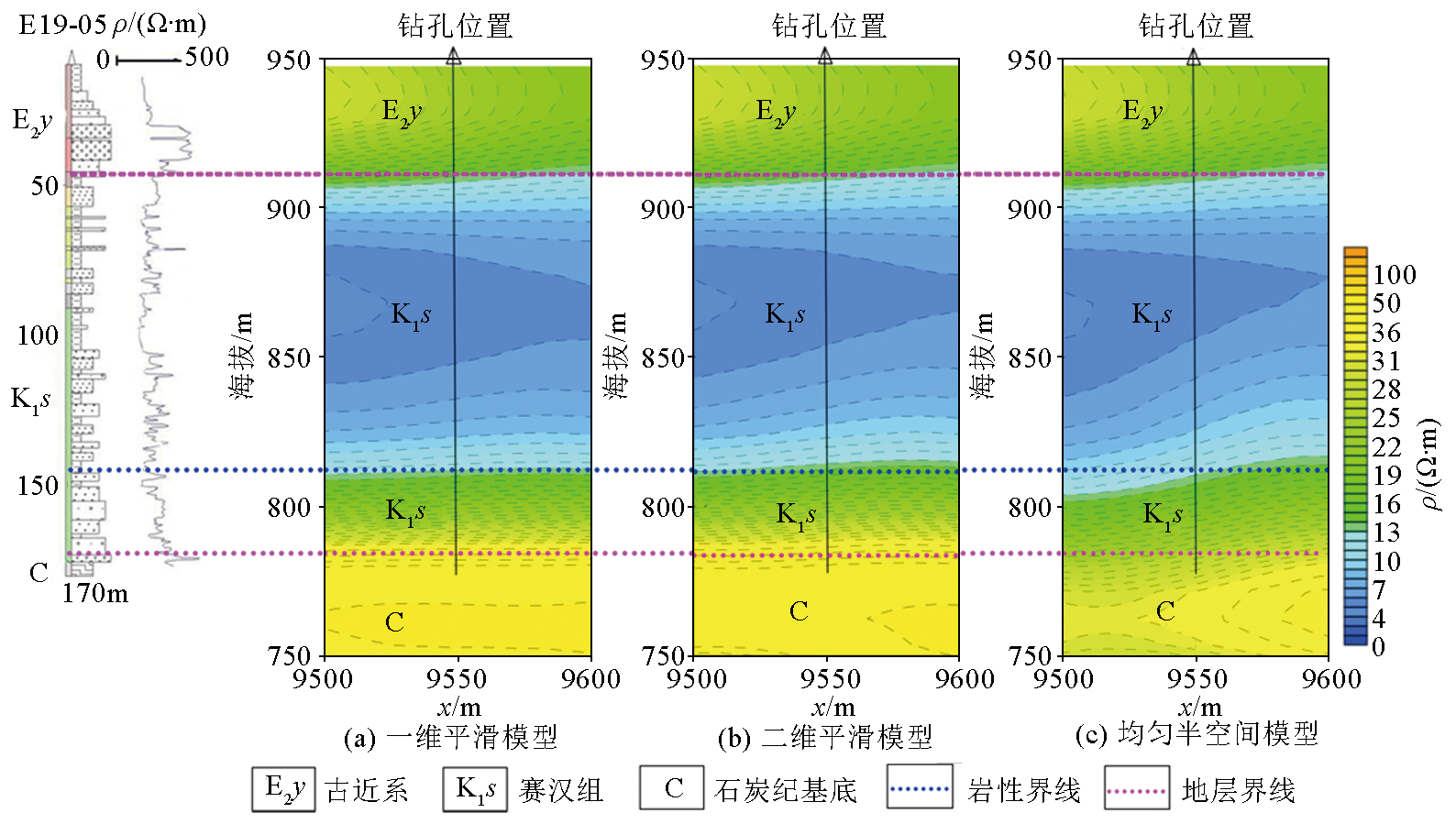 | Fig.4 Comparision of inversion results of different background models near the borehole |