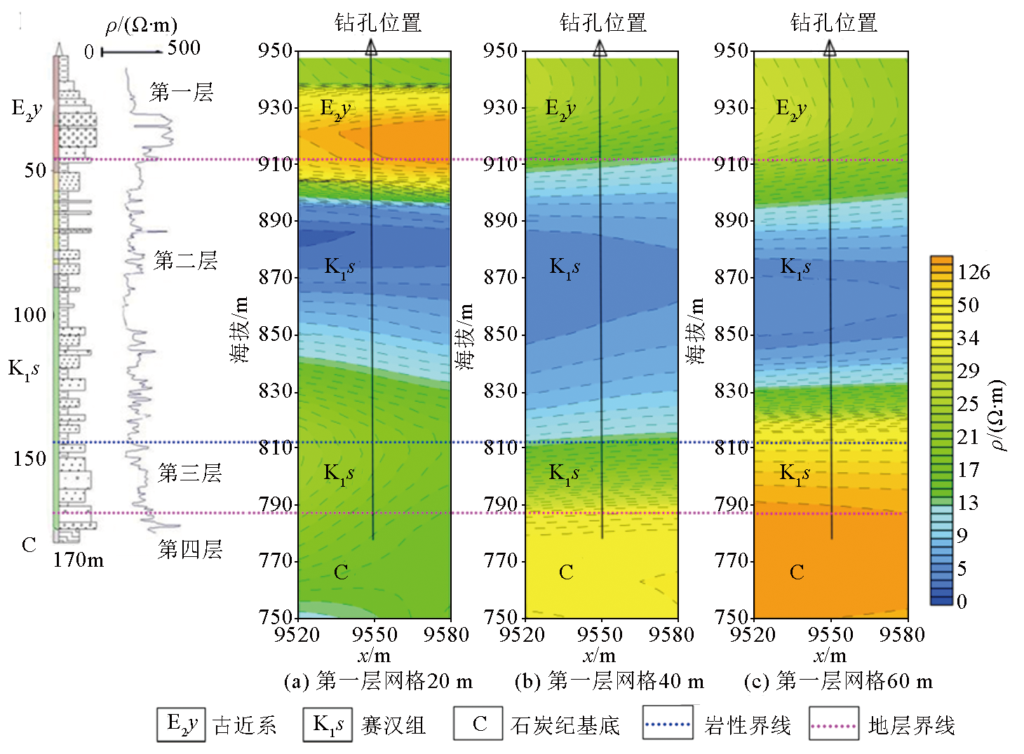 | Fig.5 Comparision of inversion results of different grids near the borehole |