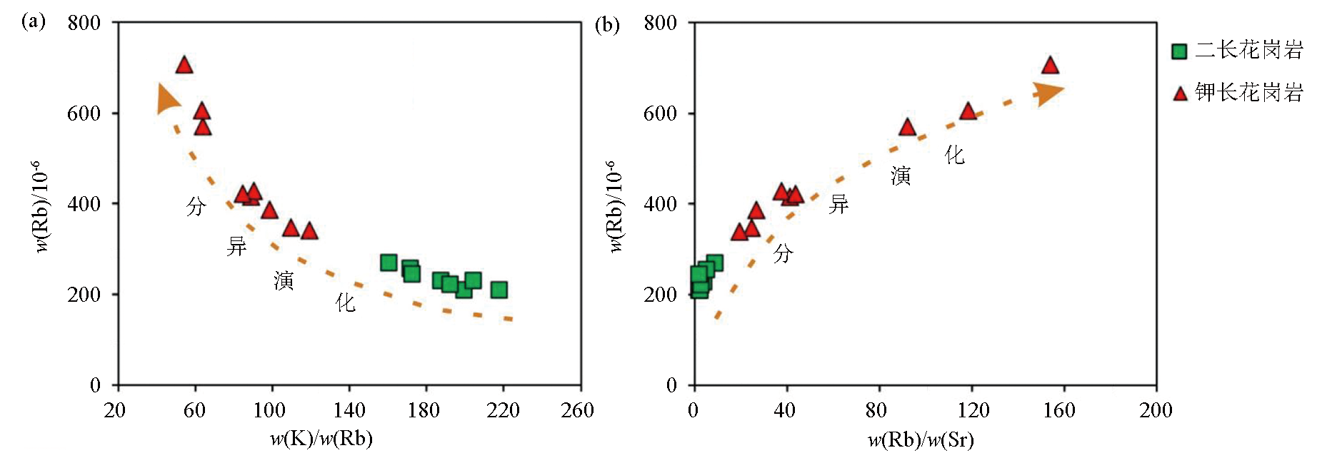 | 图8 伏岭岩体各阶段w(Rb)-w(K)/w(Rb)及w(Rb)-w(Rb)/w(Sr)协变图解 |
