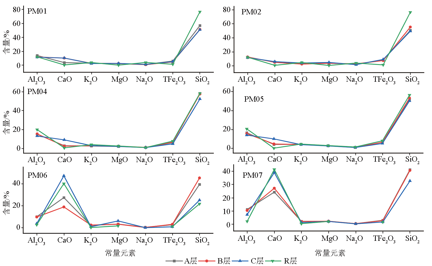 | 图6 岷江上游干旱河谷区汶川段风化壳剖面常量元素分布 |