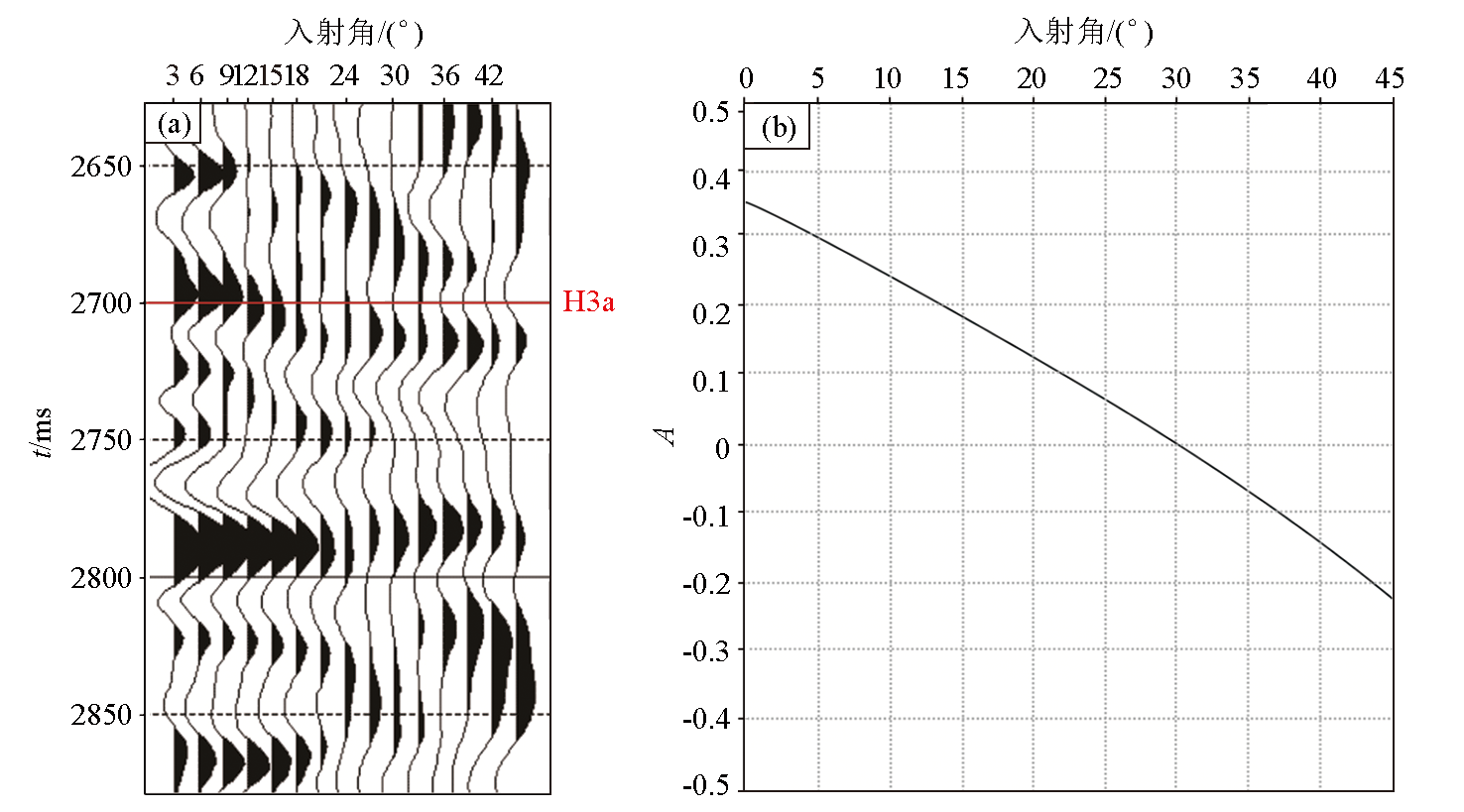 | 图7 研究区H3a层的地震道集(a)和AVO曲线特征(b) |