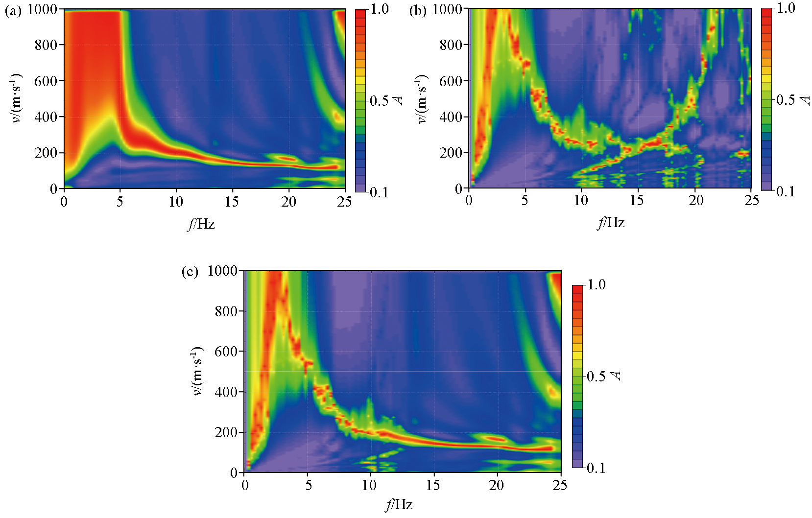 | 图4 多源数据的频散谱合并前后对比 a—瞬态面波源频散谱;b—微动台阵源频散谱;c—混合源频散谱 |