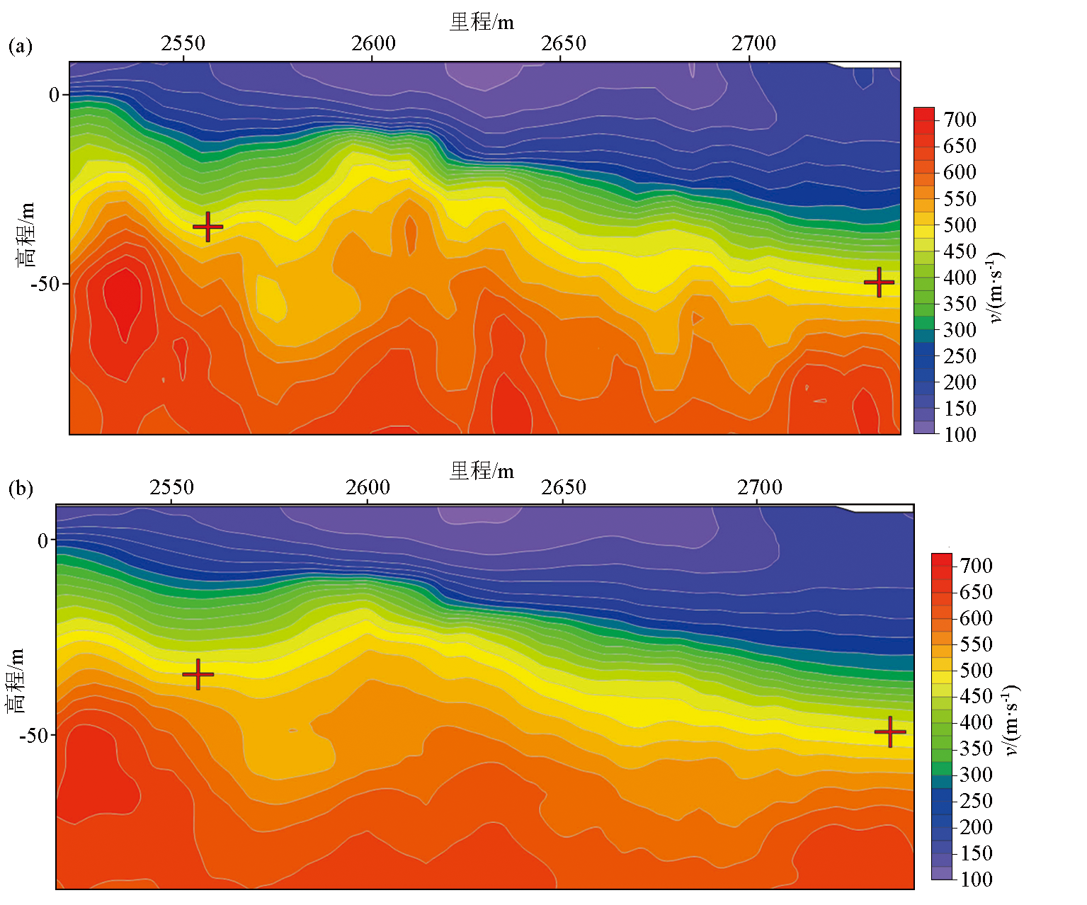 | 图9 反演后的横波速度剖面成果 a—基于非均匀介质反演的横波速度剖面;b—基于水平水层层状介质反演的横波速度剖面 |