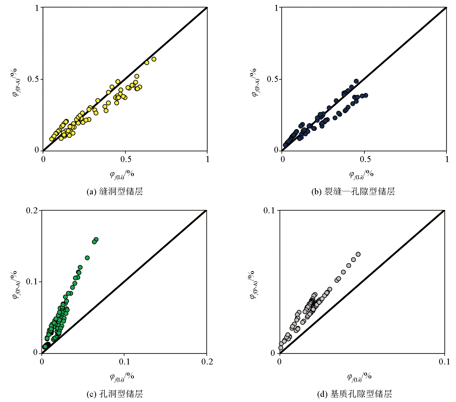 | Fig.3 Comparison of fracture porosity calculated by two methods in each reservoir |