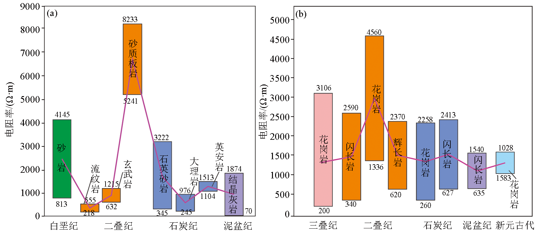| 图2 研究区各类岩石电阻率特征 a—区域地层岩石电阻率特征;b—区域岩浆岩电阻率特征 |