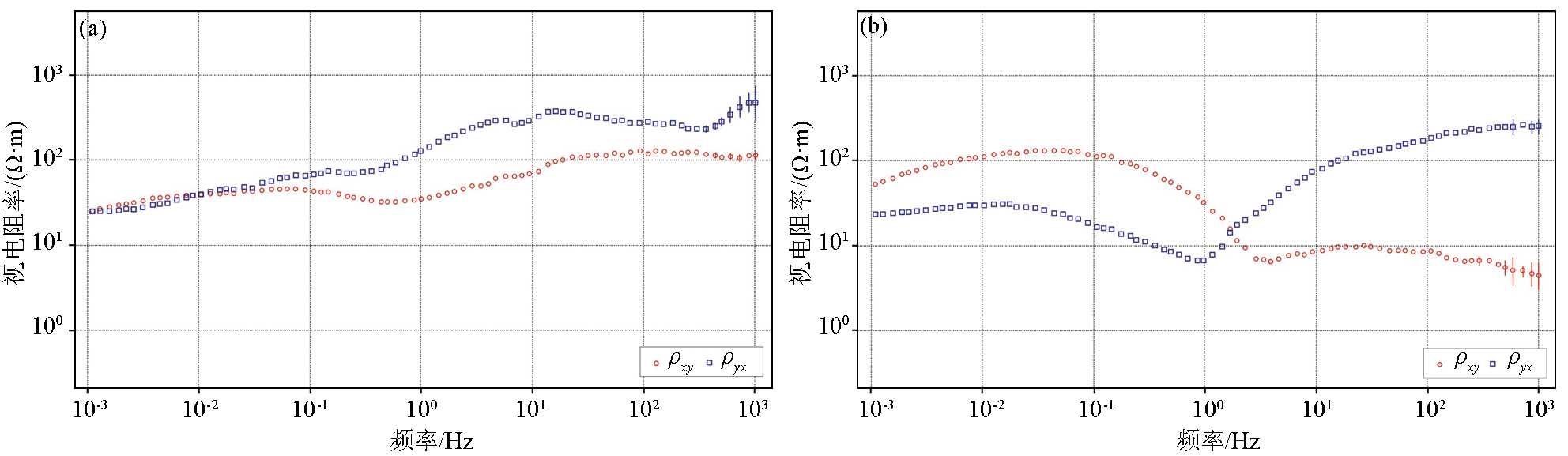| 图4 典型测点大地电磁观测曲线 a—研究区西北侧岩浆岩体大地电磁观测曲线;b—研究区中部盆地大地电磁观测曲线 |