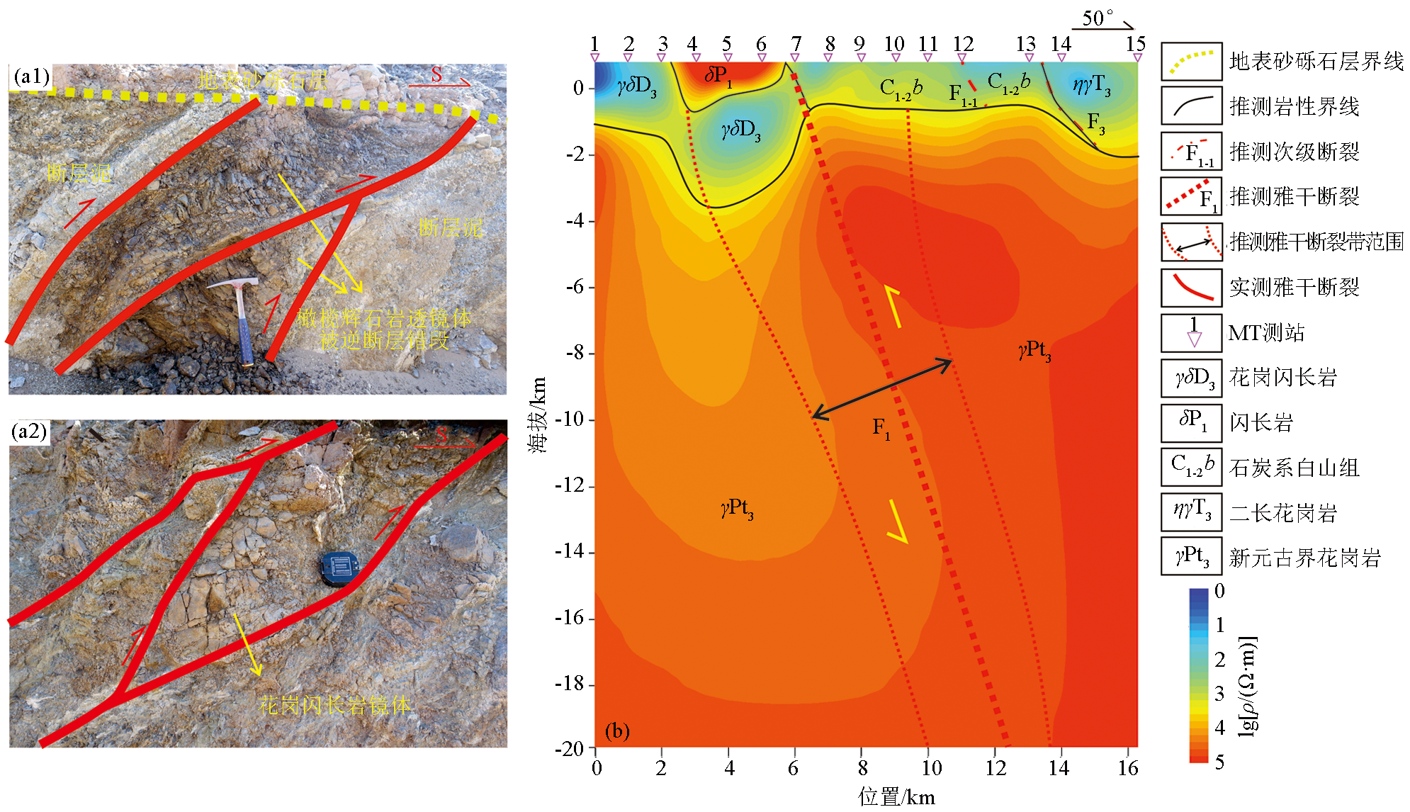 | 图7 雅干断裂野外照片(a1)、(a2)及MT01剖面大地电磁测深二维反演结果(b) |