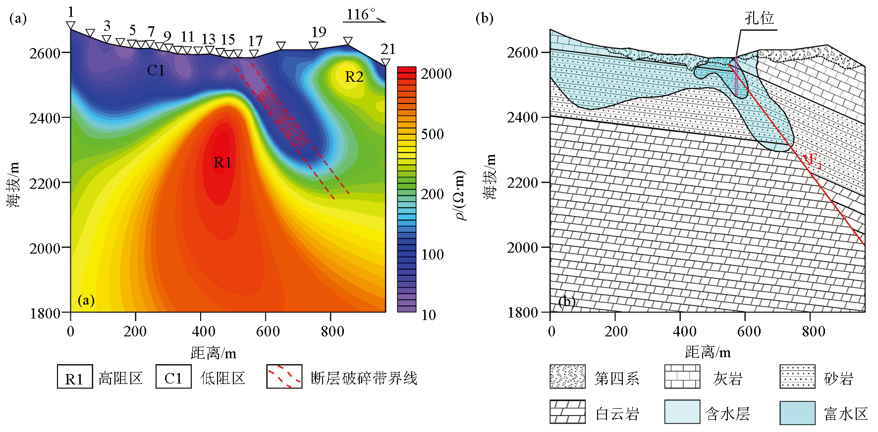 | 图6 音频大地电磁剖面反演异常(a)及其推断解释(b) |
