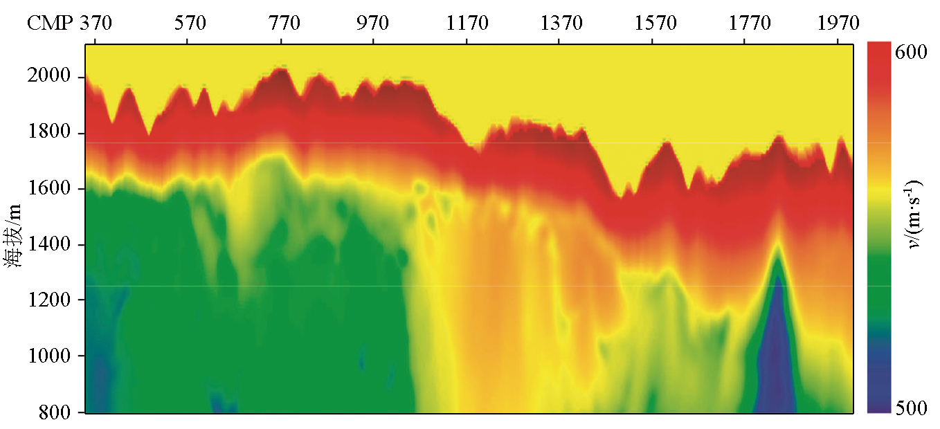 | 图3 L线束Inline20线初至波层析反演的近地表速度模型 |