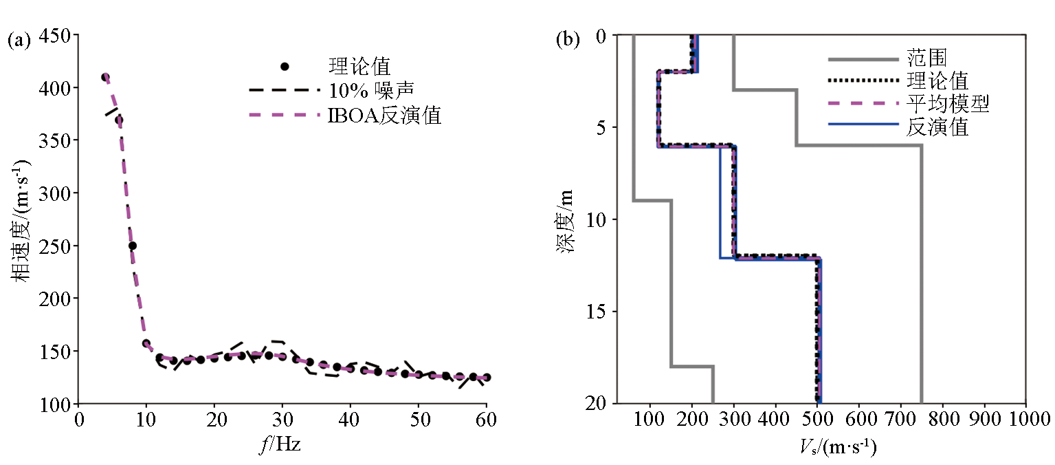 | Fig.10 Inverted results of model 2 by IBOA with 10% random noise a—dispersion curves of theoretical model and inverted model;b—shear wave structures of theoretical model and inverted model |