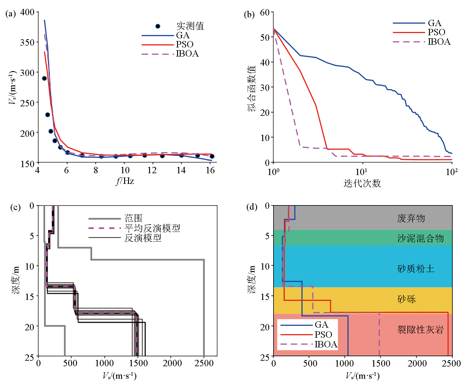 | 图14 实测资料不同算法反演结果 a—最终反演结果计算得到的理论频散曲线与实测频散数据对比;b—不同算法的迭代收敛曲线;c—IBOA算法10次反演模型结果及平均值;d—最终反演模型与实际钻孔揭露地层对比 |