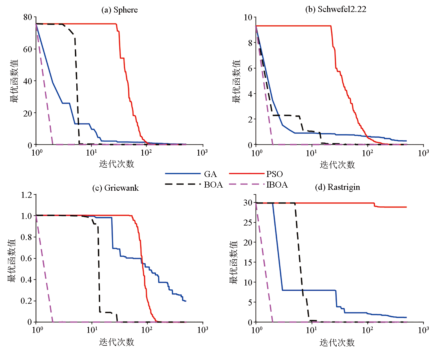 | 图5 不同算法在测试函数上的迭代收敛特征 a—Sphere函数迭代收敛曲线;b—Schwefel 2.22函数迭代收敛曲线;c—Griewank函数迭代收敛曲线;d—Rastrigin函数迭代收敛曲线 |