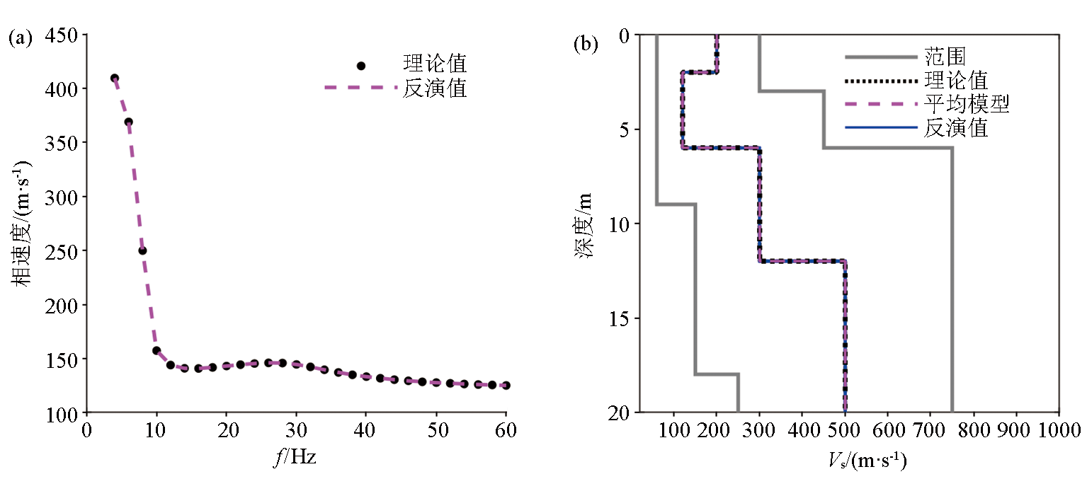 | Fig.7 Inverted results of model 2 by IBOA without noise a—dispersion curves of theoretical model and inverted model;b—shear wave structures of theoretical model and inverted model |