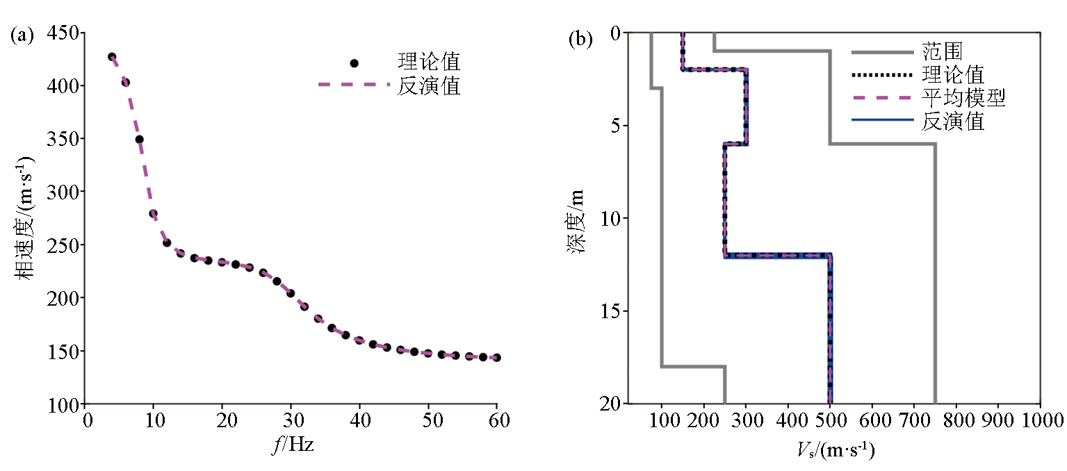 | 图8 无噪声条件下IBOA算法对模型3的反演结果 a—频散曲线拟合情况;b—反演模型速度剖面 |