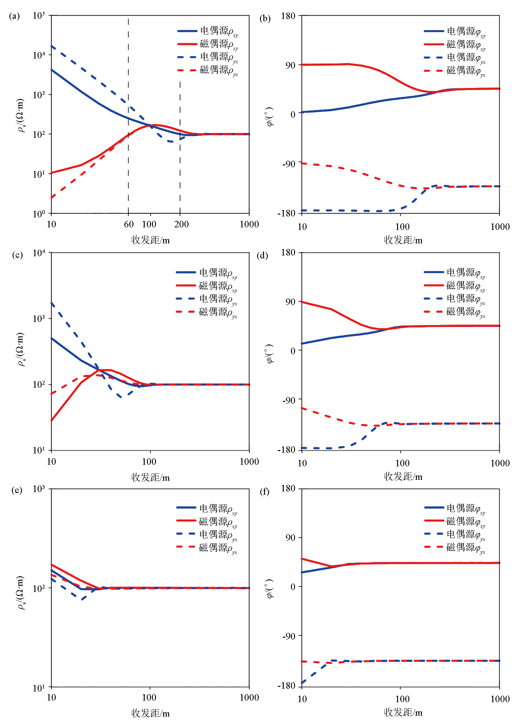 | Fig.10 Effect of transceiver distance variation on the tensor apparent resistivity and phase of the orthogonal horizontal electric and magnetic dipole sources a—10 kHz frequency transmit effect on resistivity;b—10 kHz frequency transmit effect on phase;c—100 kHz frequency transmit effect on resistivity;d—100 kHz frequency transmit effect on phase;e—1 000 kHz frequency transmit effect on resistivity;f—1 000 kHz frequency transmit effect on phase |