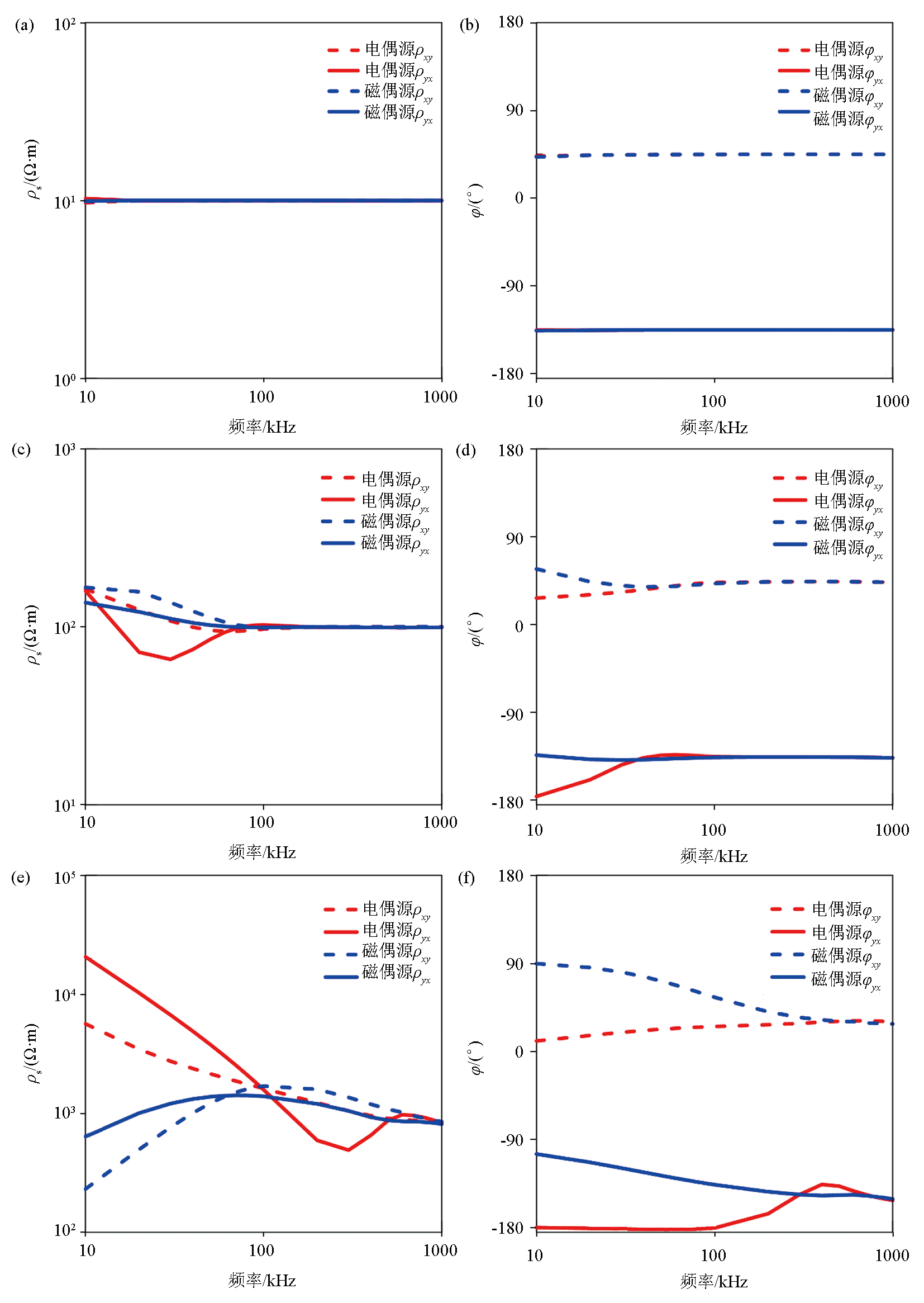 | 图11 不同背景电阻率在正交水平电偶源和磁偶源激励下张量视电阻率和相位随频率的变化 a—背景电阻率为10 Ω·m的视电阻率变化;b—背景电阻率为10 Ω·m的相位变化;c—背景电阻率为100 Ω·m的视电阻率变化;d—背景电阻率为100 Ω·m的相位变化;e—背景电阻率为1 000 Ω·m的视电阻率变化;f—背景电阻率为1 000 Ω·m的相位变化 |