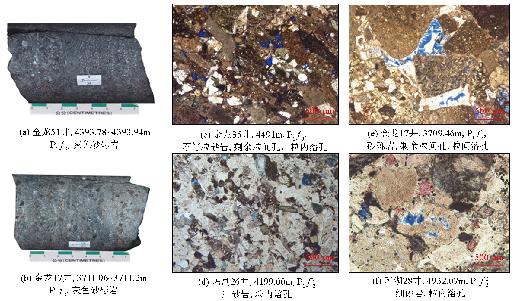 | Fig.4 Core and thin section photos of typical well P1f Formation glutenite rocks in Mahu Depression |