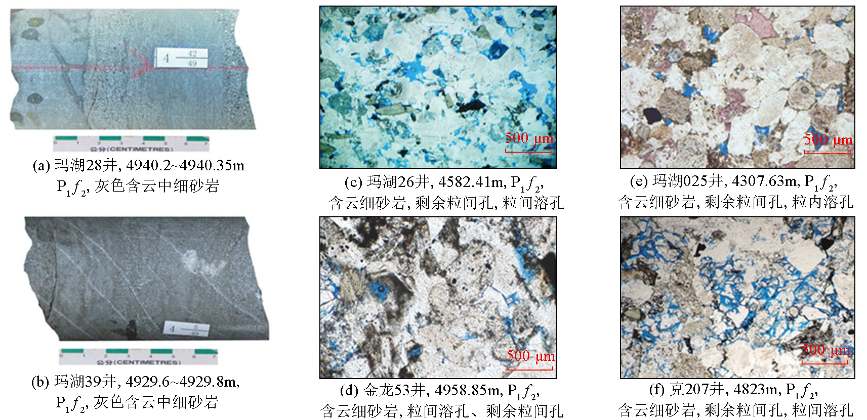 | Fig.6 Core and thin section photos of typical well P1f Formation dolomitized sandstone in Mahu Depression |
