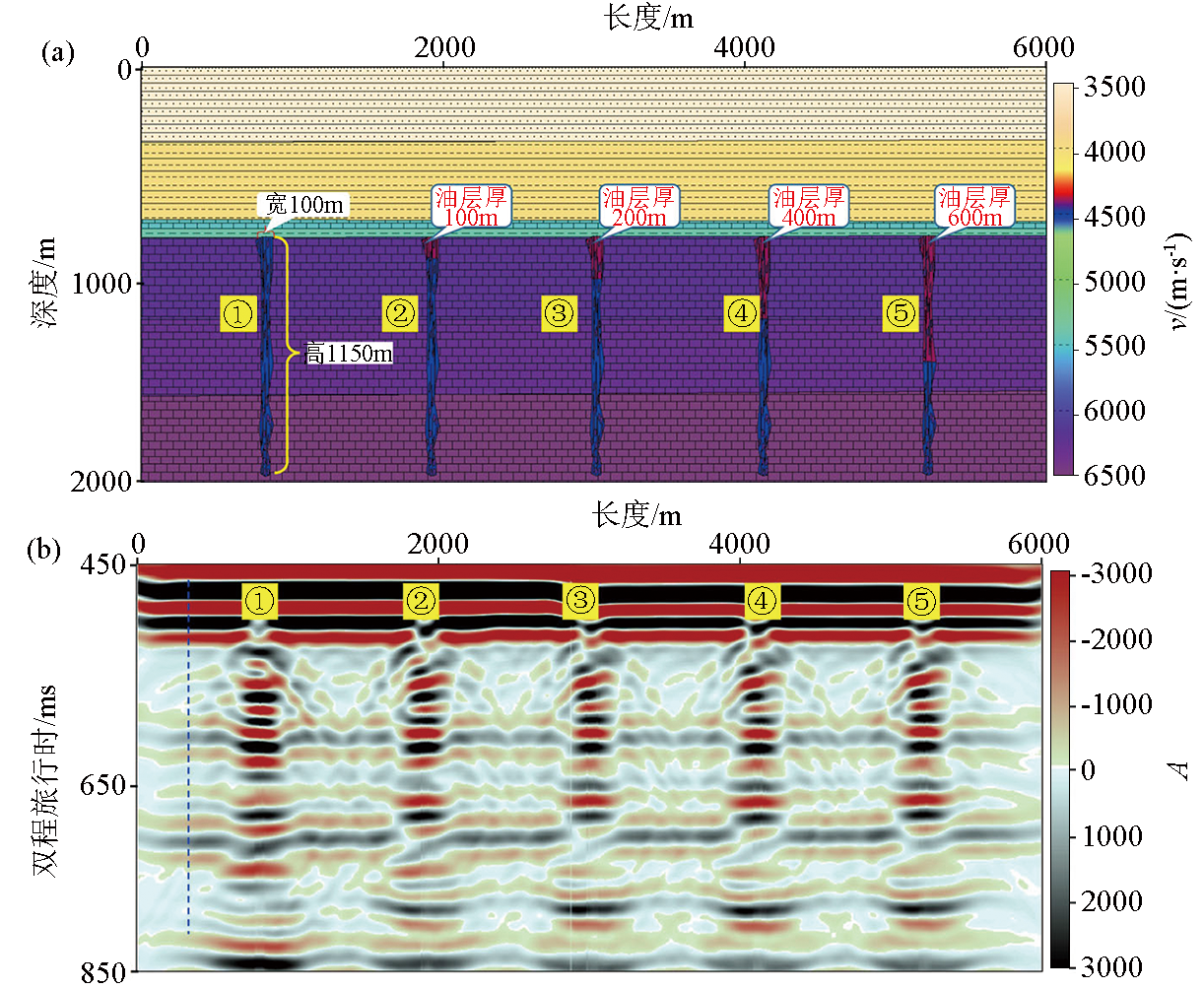 | 图2 不同油层厚度的断缝体油藏地质模型(a)和正演模拟成果数据的地震剖面(b) |